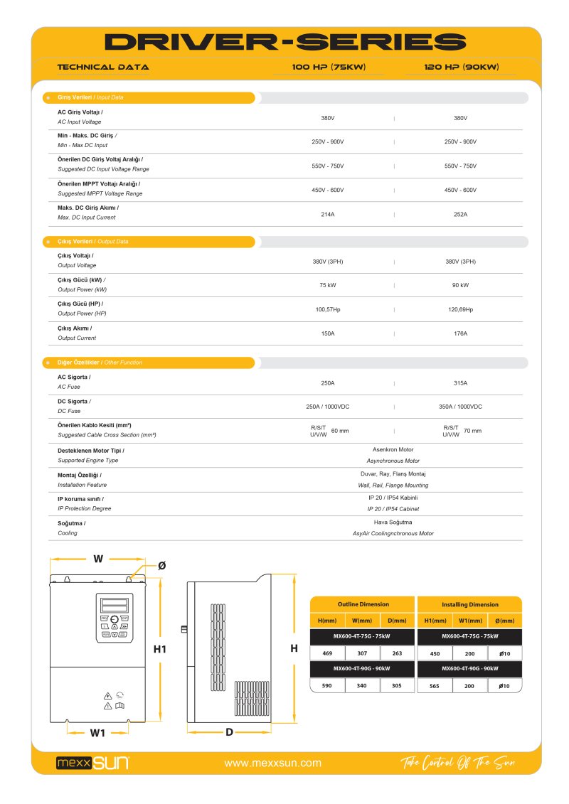 Mexxsun 100Hp 75 kW Solar Pompa Sürücüsü Trifaze Ürün Teknik Özellikler