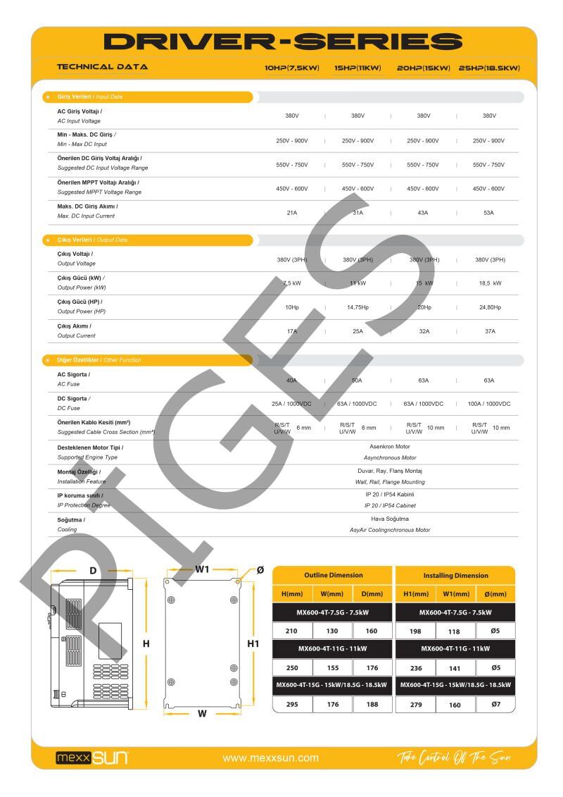 Mexxsun 15 Hp (11 kW) Solar Pompa Sürücüsü Trifaze Ürün Teknik Özellikler