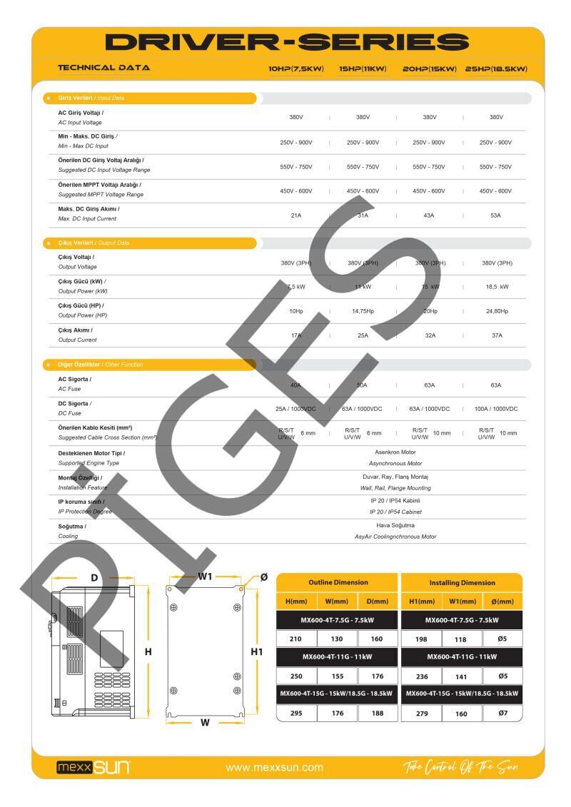 Mexxsun 20 Hp (15 kW) Solar Pompa Sürücüsü Trifaze Ürün Teknik Özellikler