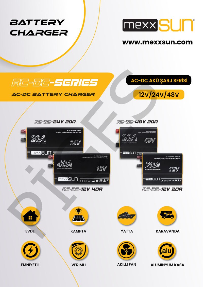 Mexxsun AC-DC Akü Şarj Cihazı 24V-20A, 24V çıkış voltajı ve 20A şarj kapasitesiyle, güçlü ve güvenilir bir enerji çözümüdür.
