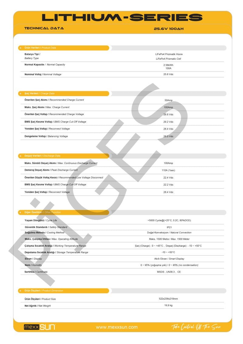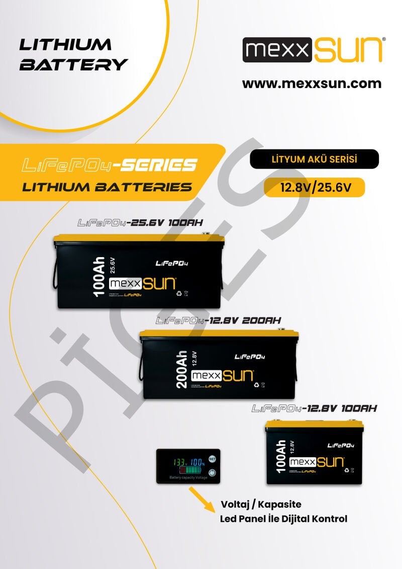 MEXXSUN Lityum Akü 25.6V 100Ah (LiFePO4), yüksek kapasite, güvenlik ve uzun ömür özellikleri ile enerji depolama ihtiyacınız için güvenilir ve verimli bir çözüm sunar.