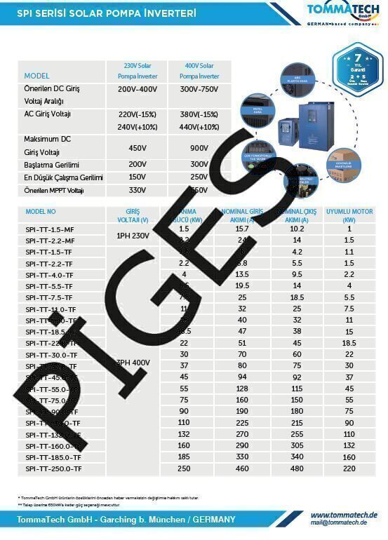 TommaTech 10 hp / 7.5 kW 1000VDC 3 Faz/380VAC Sulama Pompası İnverteri
