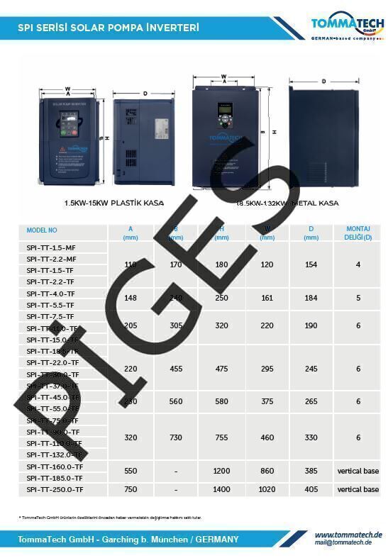 TommaTech 175hp/132 kW 900VDC 3 Faz/380VAC led ekran Solar Sulama Pompası İnverteri
