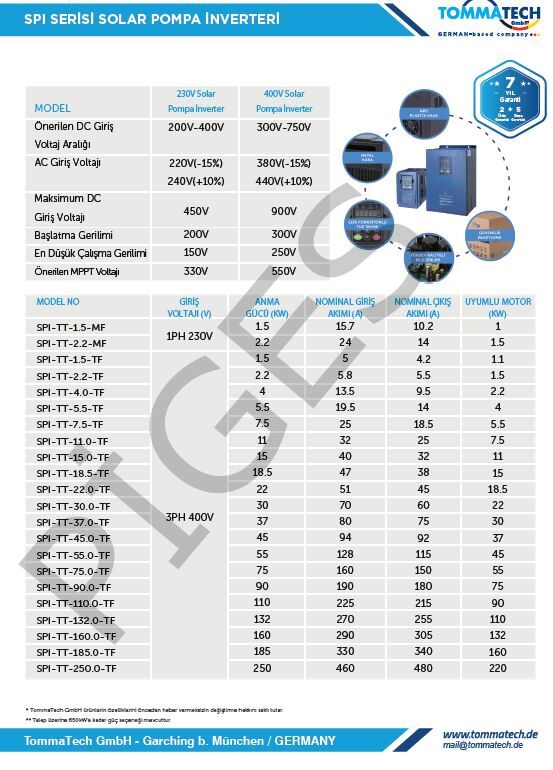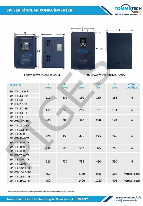 TommaTech 25 hp/ 18.5 kW 900VDC 3 Faz/380VAC Solar Sulama Pompası İnverteri