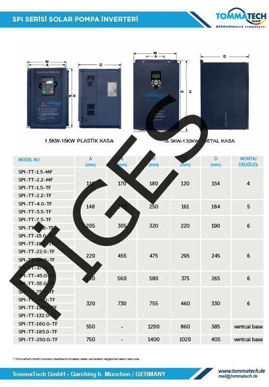 TommaTech 20 hp / 15 kW 1000VDC 3 Faz/380VAC Sulama Pompası İnverteri