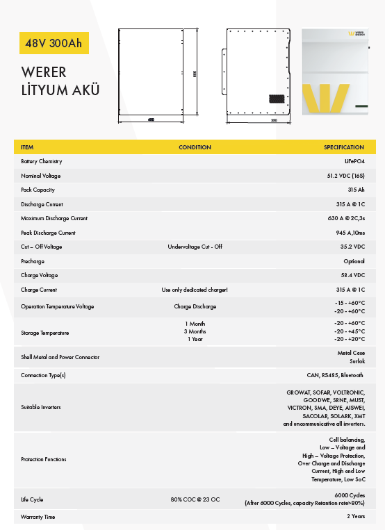 Bu ünite, serinin en güçlü ve kapsamlı modeli olan WERER ENERGY 51.2V 315Ah (16.1 kWh) versiyonudur. "WPU" (Werer Power Unit) serisi olarak adlandırılan bu batarya, sadece bir akü değil, bütünleşik bir enerji depolama istasyonu mantığıyla tasarlanmıştır.